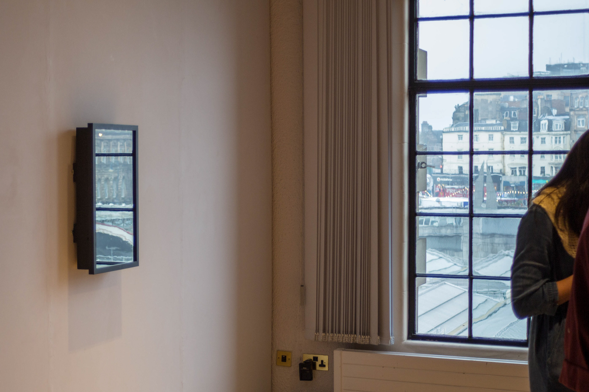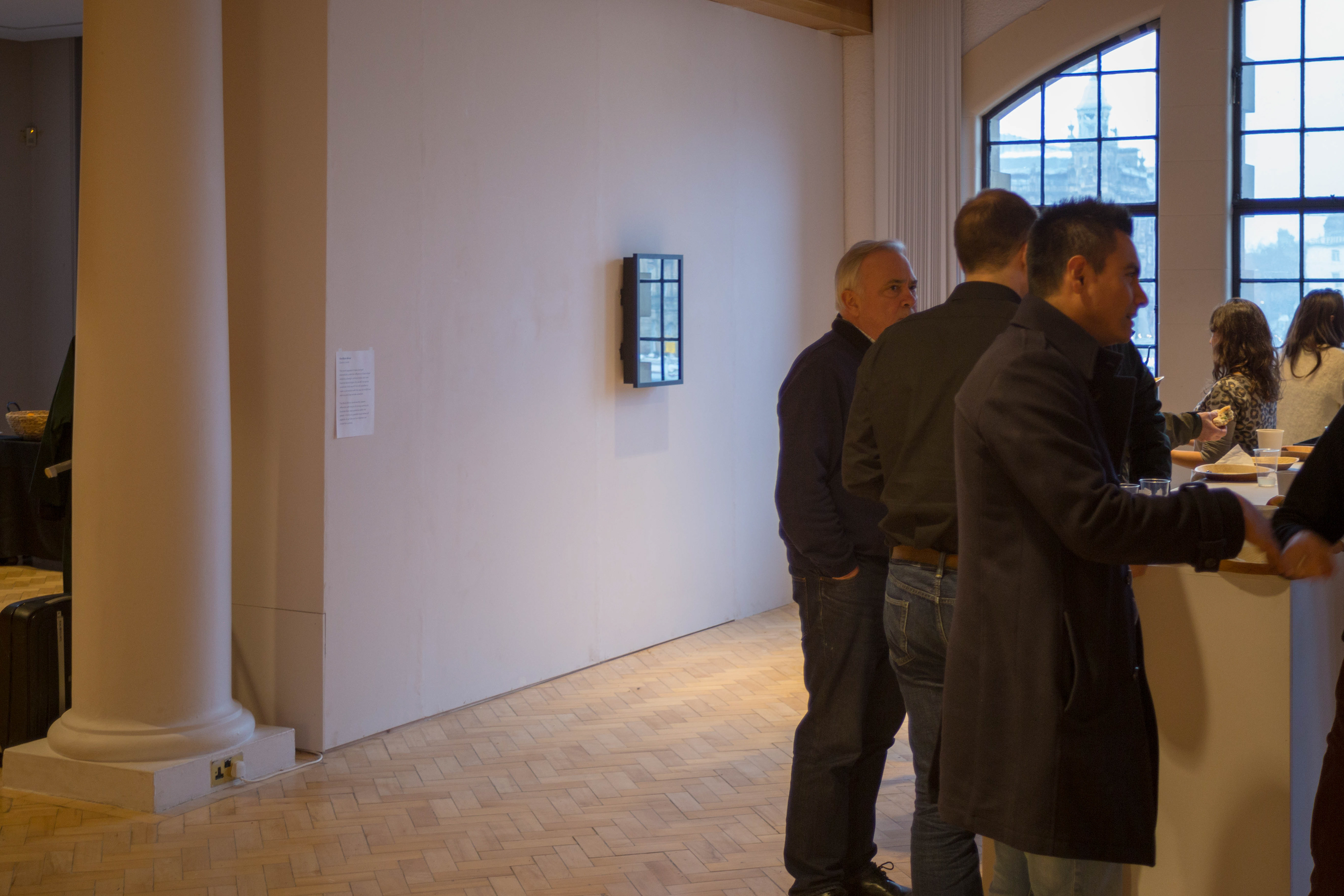 It has been exhibited twice to date. Version 0.1 was exhibited at Gateshead Library Gallery as a prototype/proof of art. Version 0.2 was exhibited in a more complete state at the City Art Gallery in Edinburgh as part of the After money symposium. I spoke at the Symposium drawing connections between art and understanding complex systems Referencing Lacanian Mirror Theory, John Dee’s black mirror and the act of Scrying as a pre-scientific way of finding meaning in impossible-to-understand systems. Scrying is a supernatural act of staring at a shiny surface until a vision appears, it comes from the English word descry which means to catch sight of something, to make out dimly, to reveal.